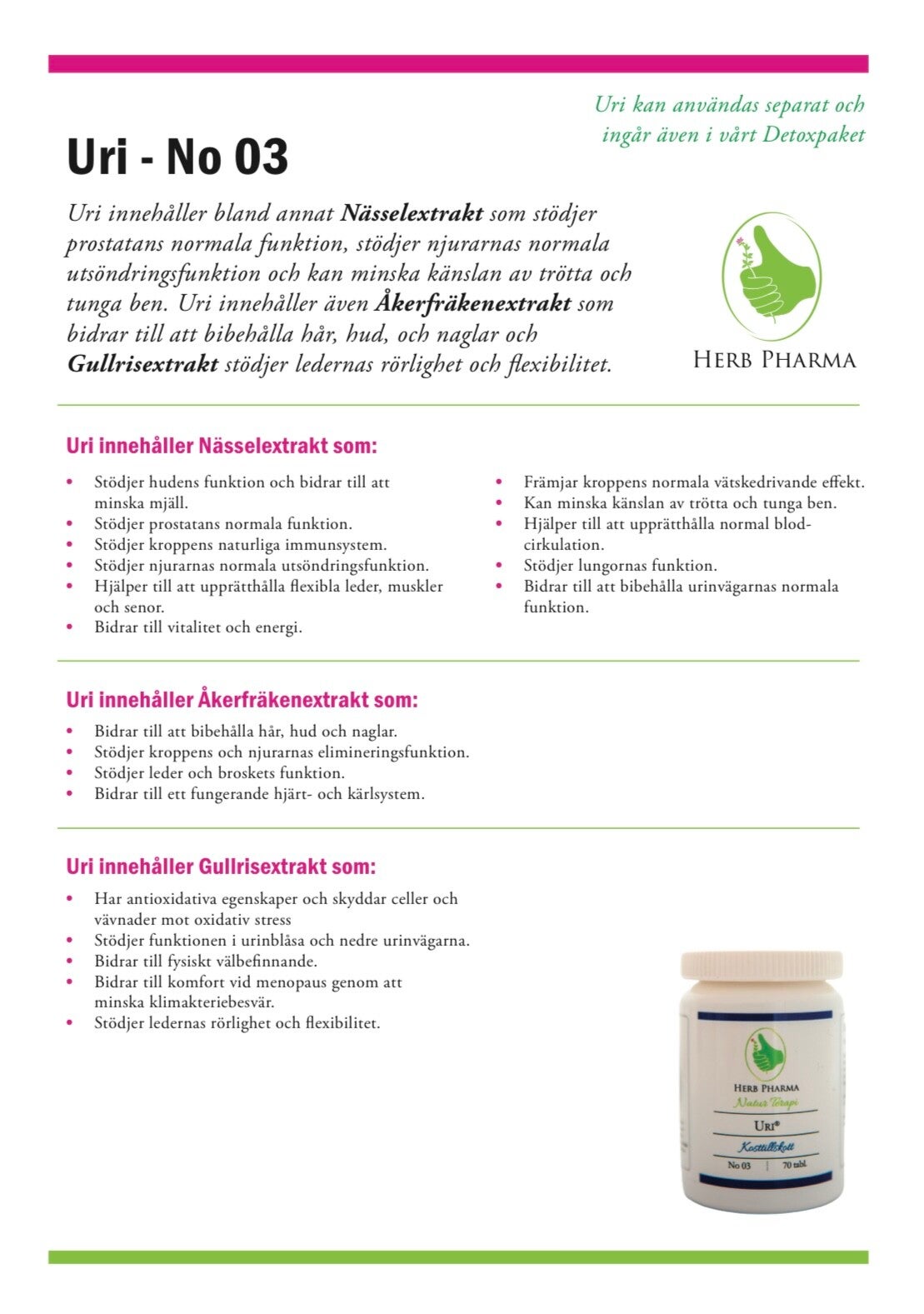 Uri innehåller bl.a. nässla som kan minska känslan av trötta och tunga ben. Stödjer prostatans normala funktion.