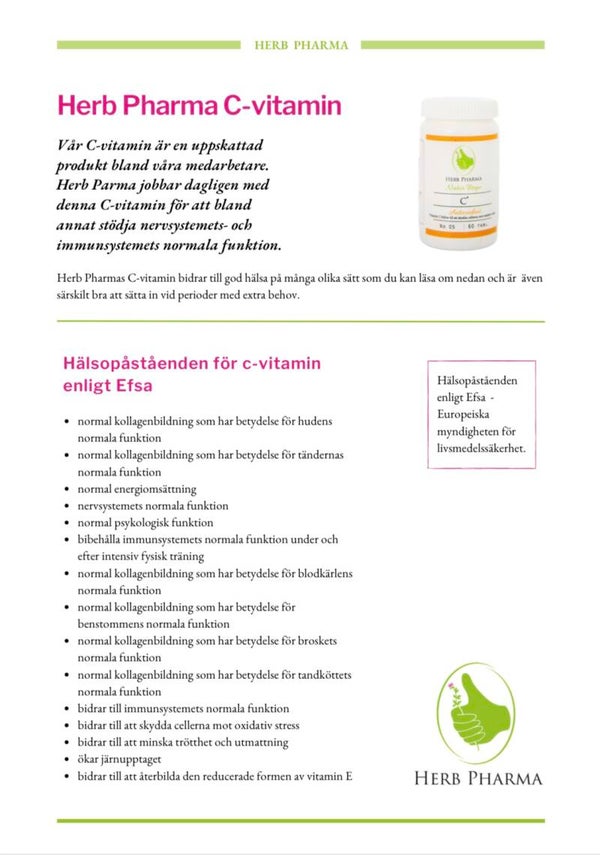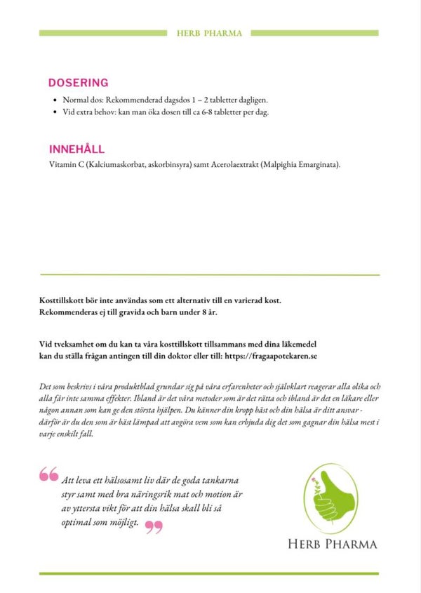 C vilken innehåller tre olika källor av C vitamin bl.a. Acerola. C vitamin är bra för normal psykologisk funktion, bidrar till att minska trötthet och utmattning.