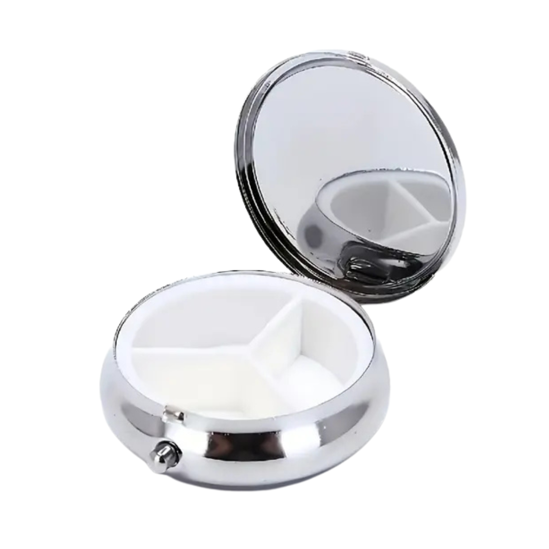 Rund förvaringsask i nickelfri metall med tre fack, perfekt för dina kosttillskott/örter när du är på resande fot, får lätt plats i en ficka.