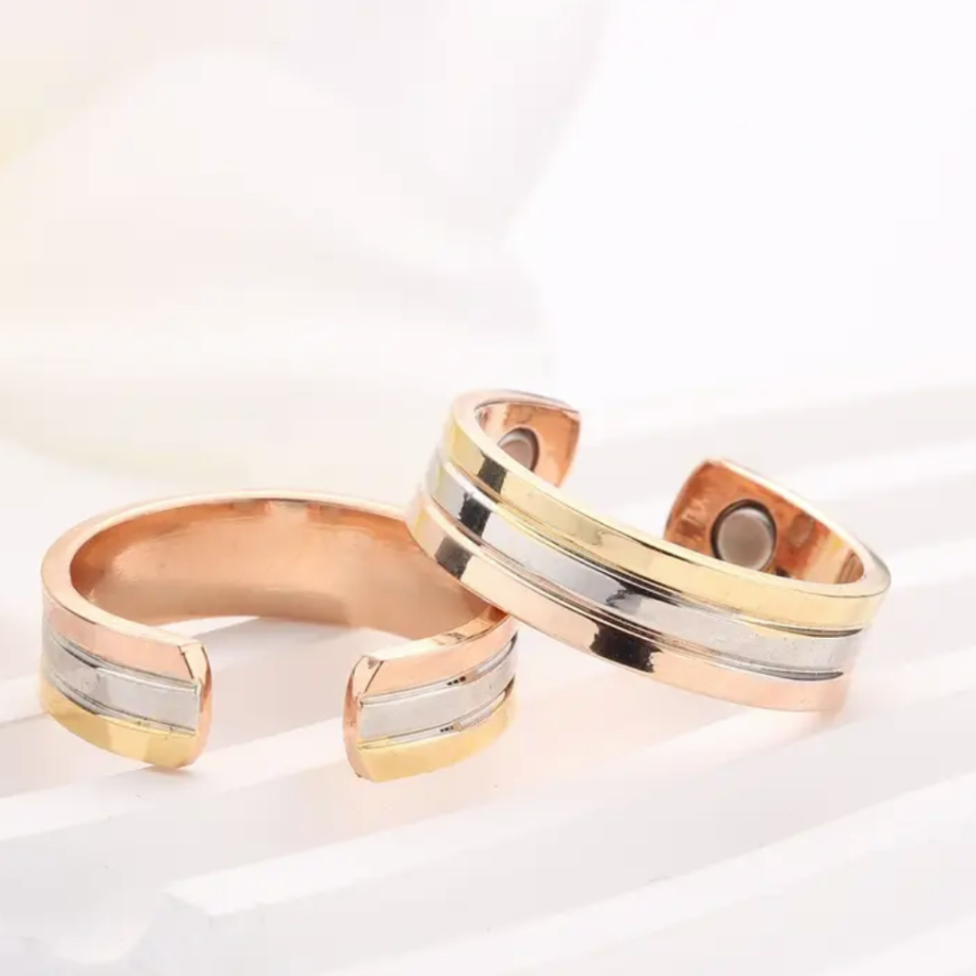 En magnetisk ringgjord av koppar har både de gynnsamma effekterna av magneter och koppar. Koppar är ett viktigt grundämne som används av röda blodkroppar för att transportera syre. Koppar är också viktigt för produktionen av kollagen, vilket är en stor betydelse för våra ben, brosk, hud, hår och för att upprätthålla kroppens immunförsvar. Personer som lider av artrit säger att koppar kan minska smärta och inflammation eftersom spår av mineralet tränger in och lindrar.