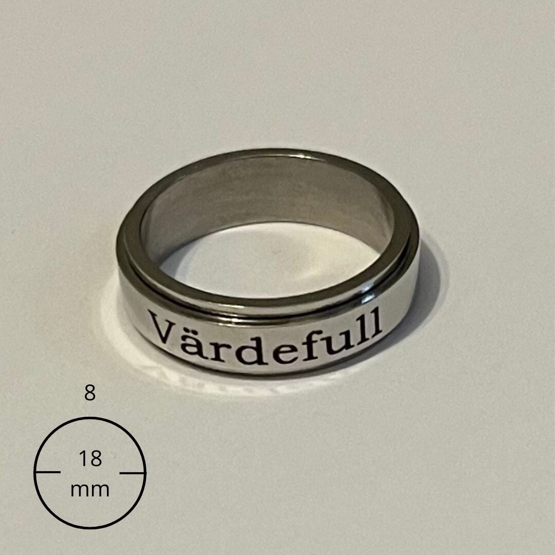 Anti-Stress ring med ett budskap att du är värdefull. Ringen är snygg och stilren samt designat för att lindra stress och främja avslappning. Denna unika ring har en inbyggd fidget-spinnare som gör att ovandelen kan snurras på, vilket ger en lugnande och tillfredsställande sensorisk upplevelse.