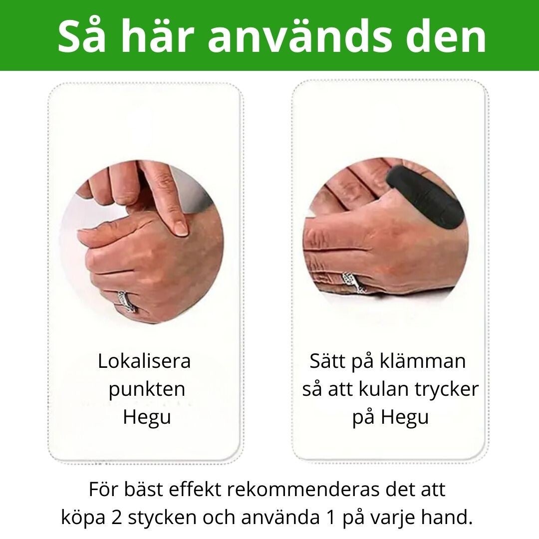 Denna akupressurklämma är magnetisk och kan lindra dina symtom vid huvudvärk, migrän och spänningar och är ett holistiskt hjälpmedel. Den sätts enkelt på plats på handen där den stimulerar en av kroppens mest kraftfulla akupunkturpunkter. (Se bild.)