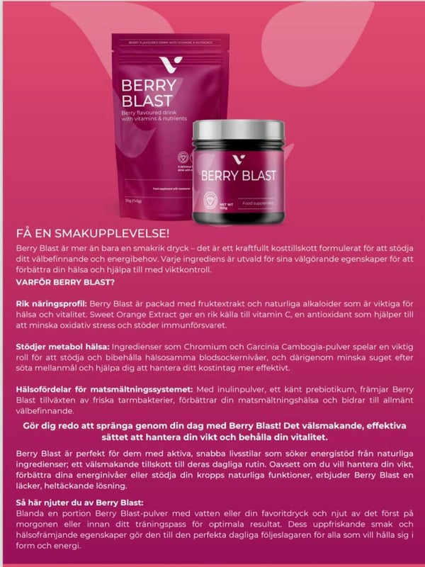 Berry Blast är mer än bara en smakrik dryck – det är ett kraftfullt kosttillskott formulerat för att stödja ditt välbefinnande och energibehov. Varje ingrediens är utvald för sina välgörande egenskaper för att förbättra din hälsa och hjälpa till med viktkontroll.